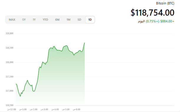 تتداول البيتكوين حالياً قرب مستوى 118,754 دولاراً أمريكياً، مسجلة ارتفاعاً بنسبة 0.75% مقارنة بالإغلاق السابق. تراوحت أسعارها اليومية بين 116,776 و118,790 دولاراً، مع استمرار العملة في تعزيز زخمها الإيجابي، مدعومة بزيادة الاهتمام المؤسسي والتطورات التنظيمية الداعمة.