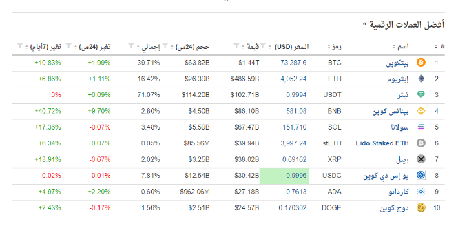 صعد سعر البيتكوين أعلى مستوى 73,100 دولارًا للسهم الواحد ويتداول الآن تحديدًا عند 73,159 دولارًا للسهم صعودًا بـ 1.93% في الـ 24 ساعة الأخيرة ليواصل كسر المقاومات وعدم التوقف عن الصعود.